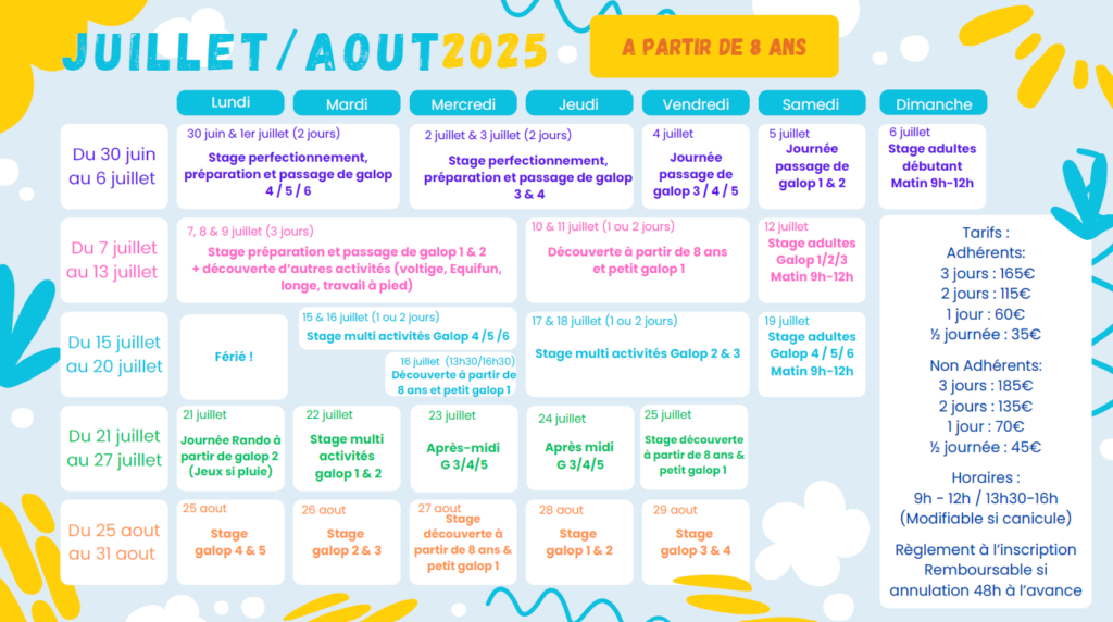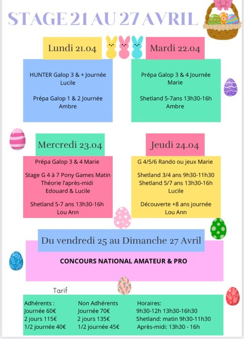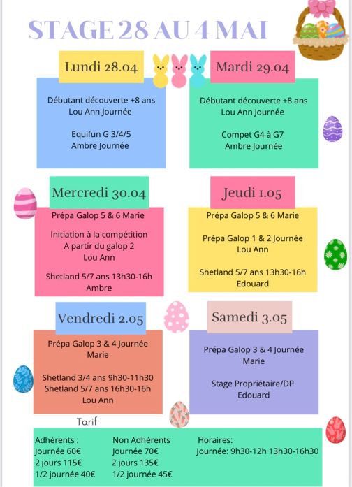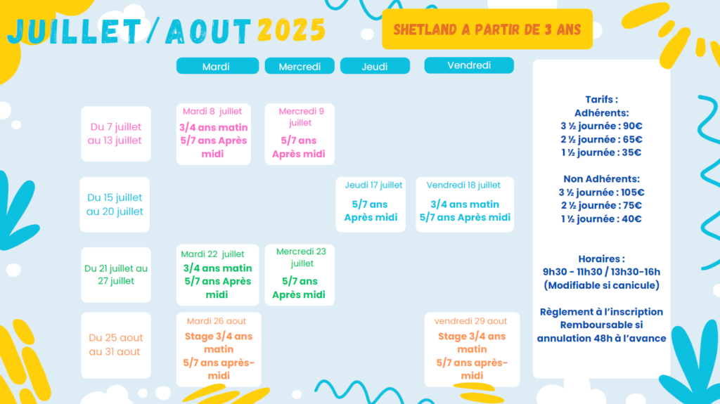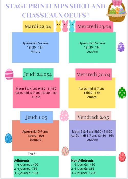 - Pour les enfants de 3 ans à 7 ans, stages shetland,en demi journée ou journée avec un gouté en fin de journée. L’occasion de passer du temps avec les poneys !